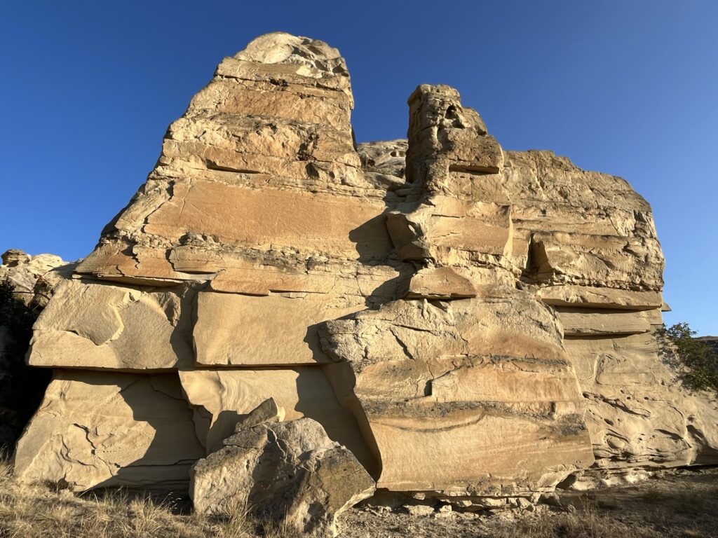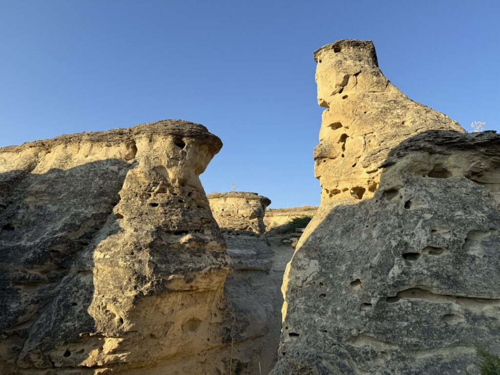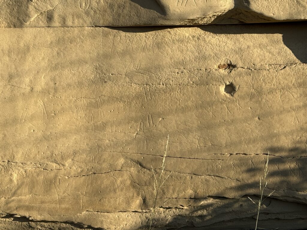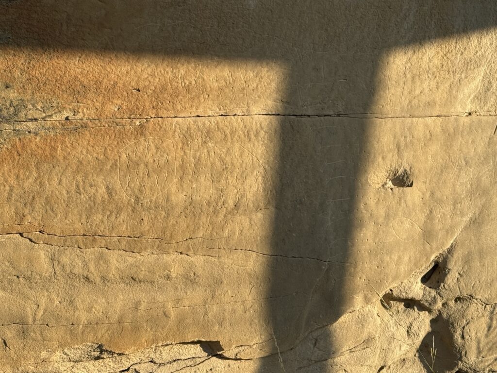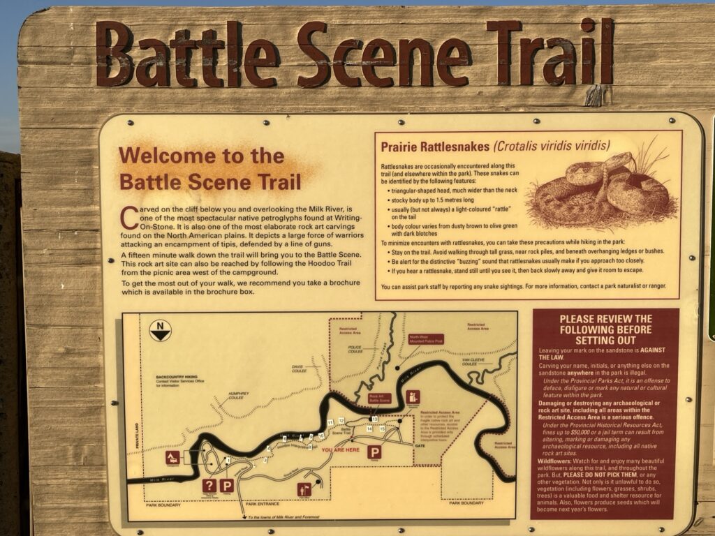 We both awoke early after a nice long sleep. Extremely quiet here but a little chilly overnight with the morning temperature being below 10°C. We made a quick exit from the campground and drove to one of the trailheads so that we could go for an early morning sunrise walk to look at some indigenous stone carvings for which the park is named. We also heard a pack of coyotes across the valley yipping and howling to each other, beautiful.