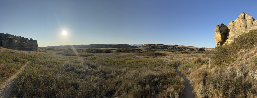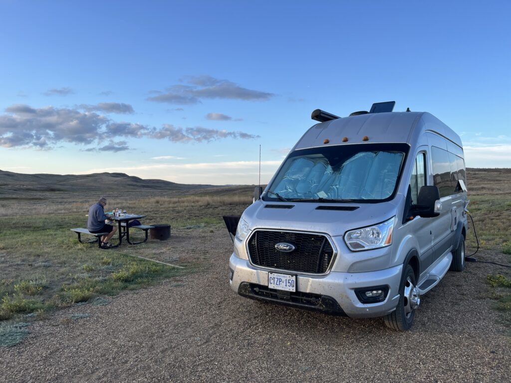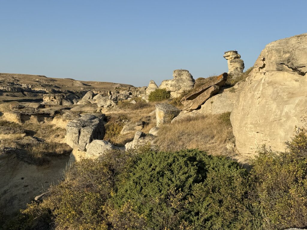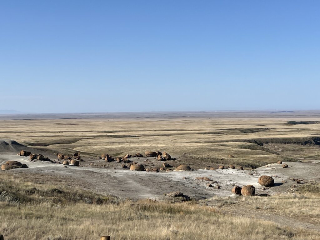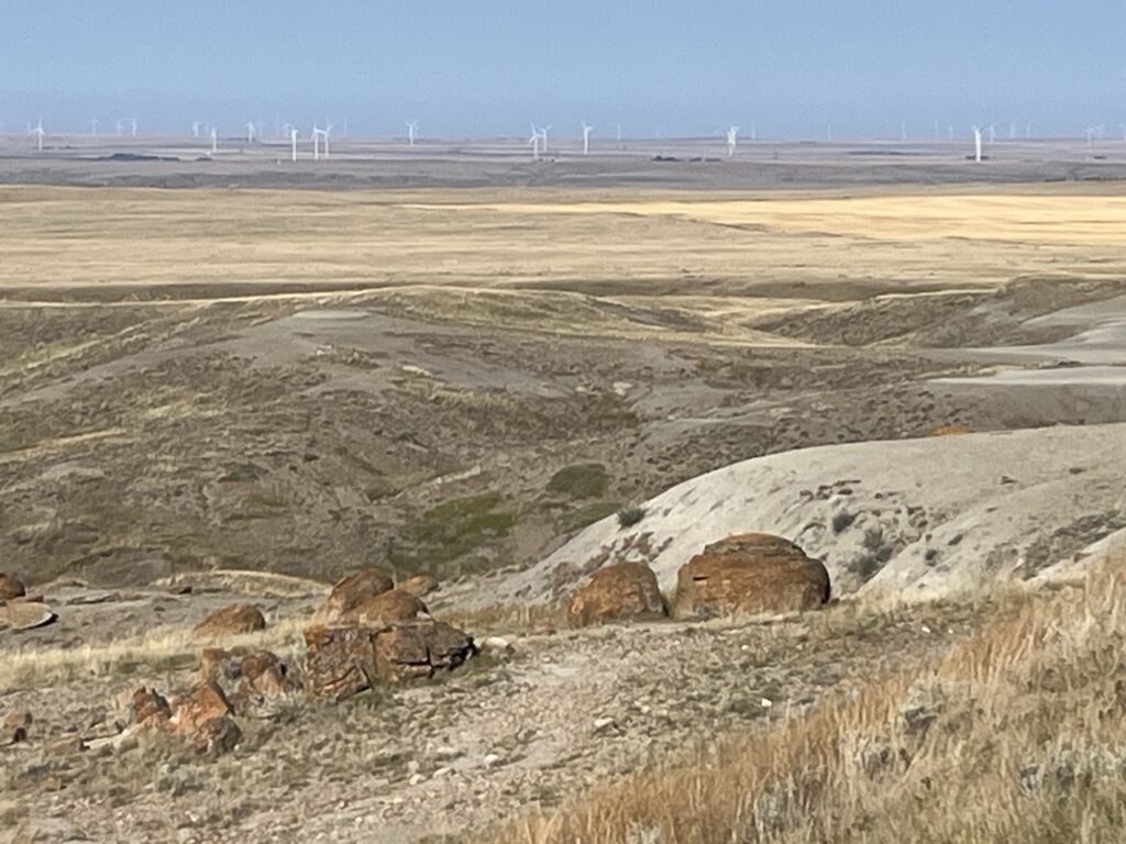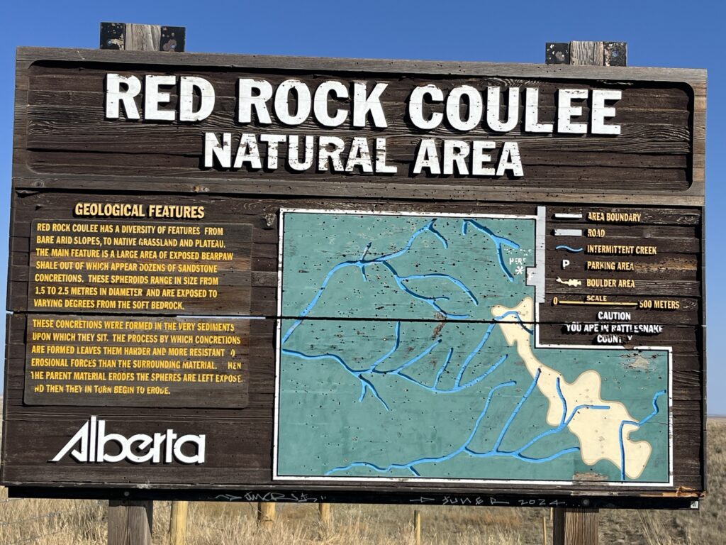 Although a cross-country route to our destination was proposed by Google maps, we chose a slightly longer route that ensured a supply of fuel. This routed us North towards Medicine Hat where we would join the Trans-Canada Highway yet again. However, before getting to the TCH we made a small detour to the Red Rock Coulee Natural Area to see the odd collection of naturally formed large red rock boulders that occur in this single location. It might also be a future boondocking location as it is quite remote with no visible neighbors and a good sized gravel parking area. It would be a wonderful dark-skies camping location.
